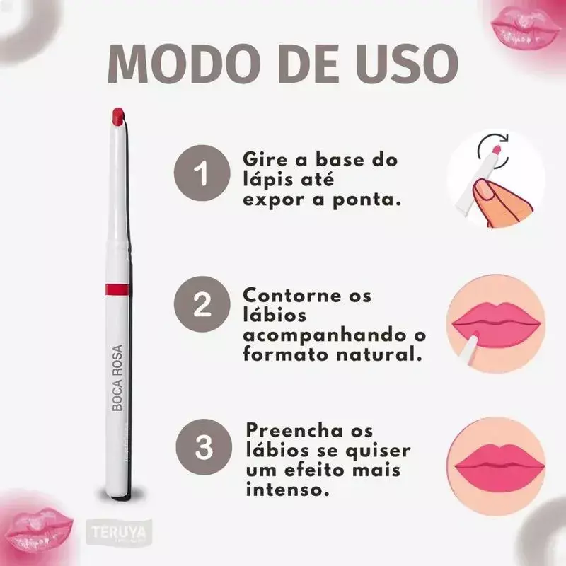 O Contorno Labial Boca Rosa tem textura cremosa que desliza fácil e entrega cor intensa desde o primeiro traço. Com ponta chanfrada e mecanismo retrátil, dispensa o uso de apontador e é perfeito para contornar e preencher com facilidade. Sua fórmula confortável e a prova d’água garante um acabamento impecável.